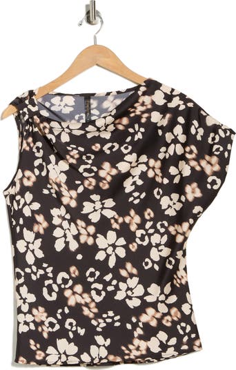Asymmetric sleeves add a bit of flirt to a floral patterned top cut from satin that's soft and smooth.