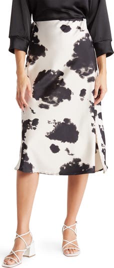 Farm-inspired cow prints accentuate a midi-length skirt for a bold, contemporary look.