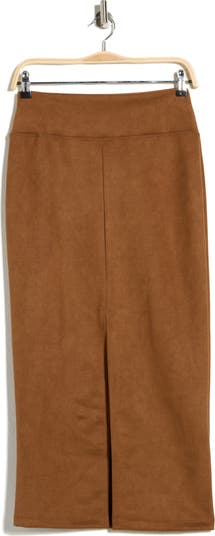 Soft faux-suede fabrication increases the style points of casual or elevated looks when you style this midi skirt complete with a front slit for ease in every movement.