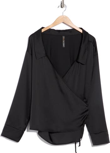 Satin fabrication gives off subtle shine when you don this woven top fashioned in a flirty faux-wrap silhouette.