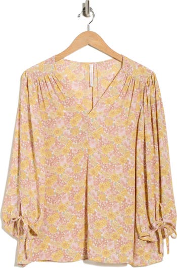 Adjustable ties define the cuffs of a lightweight woven top patterned in pretty blooms to sweeten your casual looks.
