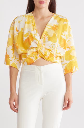 Bloom with confidence in this floral and flowy top that features a twist front and three-quarter sleeves.