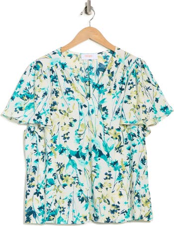 Fluttery sleeves and a bold print define a woven top that elevates your casual selection with sweet style points.