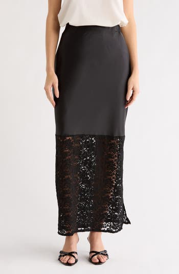 Sleek and sultry, this satin maxi skirt features a lace trim that offers a teasing peek of skin.