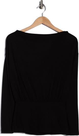 A wide-banded hem brings silhouette-skimming shape to this long-sleeve knit top framed by a boat neck.