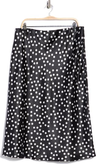 A polka-dot print brings a whimsical vibe to an ankle-grazing maxi skirt cut from soft satin that gives off liquid-like shine.