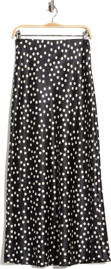 A polka-dot print brings a whimsical vibe to an ankle-grazing maxi skirt cut from soft satin that gives off liquid-like shine.