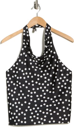 A charming dot pattern lends a whimsical vibe to a satin top cut in a halter silhouette to show off your shoulders.