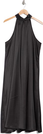 Silky satin flows down the silhouette of this tie-neck dress with a midi length.