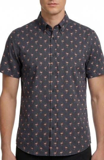A flamingos print brings tropical style to this regular fit short-sleeve sport shirt cut from lightweight, crinkled seersucker for daylong comfort.