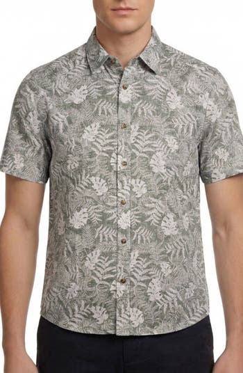 Get resort-ready style with this regular fit short-sleeve button-up shirt cut from an airy, breathable linen-cotton blend with a cool tropical print.