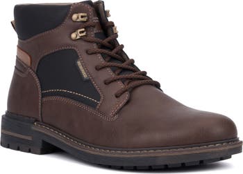 A rugged lug sole supports adventures grand and small in a faux-leather boot equipped with a lace-up vamp and padded collar.