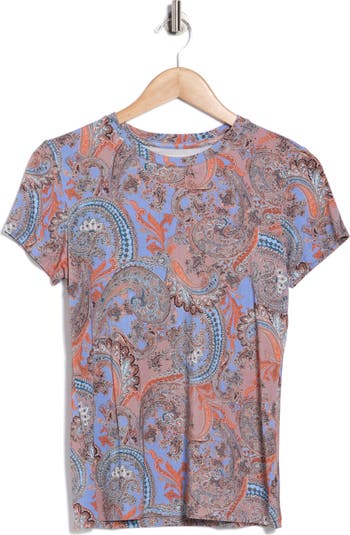 A swirling paisley print enlivens this soft stretch-kissed top framed by abbreviated sleeves.
