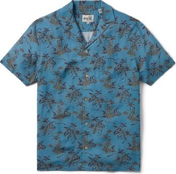Traditional Hawaiian dancers join outrigger canoes to bring the island spirit to this drapey camp shirt.