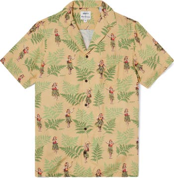 Escape to paradise in this classic-fit button-down shirt that is all about hula girls and island fun.