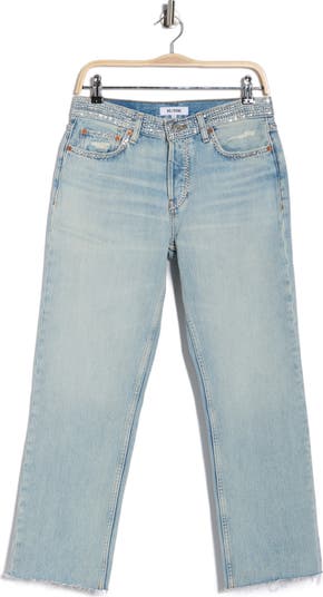 Add a little dazzle to jeans day in a roomy, straight-leg pair finished with raw, cropped hems and cut from nonstretch denim.