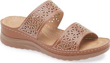Twinkling rhinestones and a lace-inspired laser-cut design add boho charm to these slide sandals set on a casual wedge heel. Signature cushioning and a grippy sole ensure all-day comfort with every step.