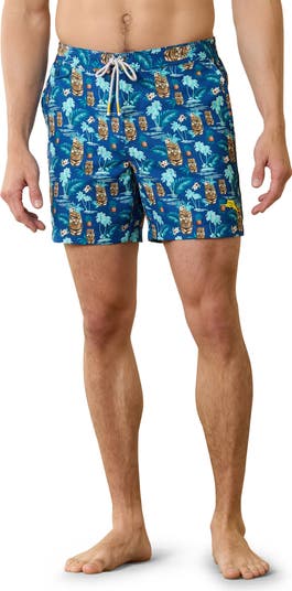 Take a refreshing dip in these sunny-day board shorts designed with a tropical print and secure pocket for your essentials.