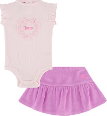 Ribbed and French terry-textured knits lend a sporty touch to this coordinated kids' set featuring a ruffled bodysuit paired with a matching pull-on skort.