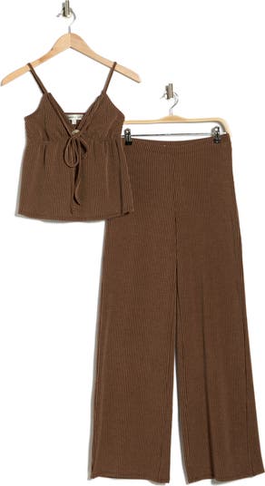 Allover ribbing texturizes a cuddly pair of pajamas that pair a babydoll tank with full-length wide-leg pants for a chic look from bedtime to your morning routine.
