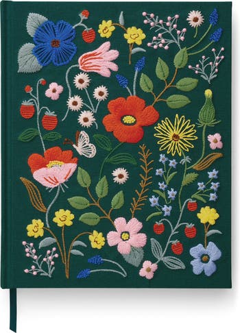 Let your pen wander in this whimsical journal featuring a canvas hardcover embroidered with strawberry-fields florals.