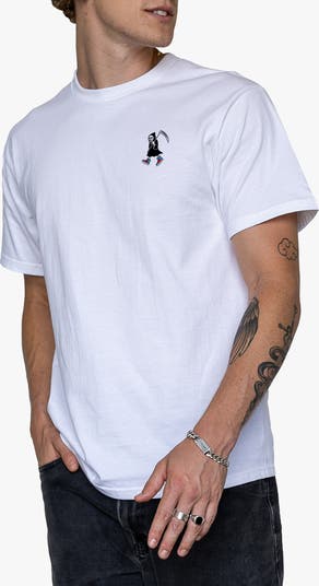 A friendly reaper graphic fronts this American-made T-shirt crafted from soft, pure cotton.
