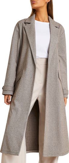 A polished herringbone design elevates this sweeping duster jacket styled with a layer-perfect open front and airy side vents.