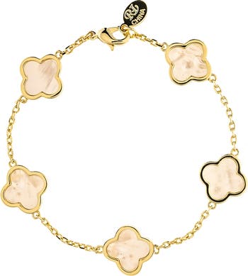 Show off elegant shine with this 18-karat gold-clad line bracelet stationed by shimmery mother-of-pearl or onyx clovers.