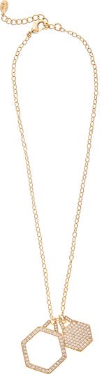 An 18K yellow gold plated necklace features a hexagonal-shaped pendant set with cubic zirconia for a glistening addition to your wardrobe.