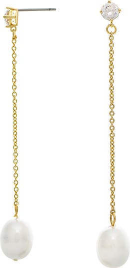Show off elegant shine with these 18-karat gold-clad earrings featuring sparkly cubic zirconia studs suspending slender chains with pearl drops.