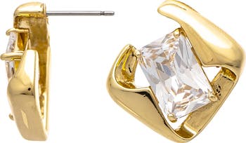 A brilliant baguette-cut cubic zirconia stone shimmers over stud earrings, gleaming 18‑karat gold plating for radiant shine.