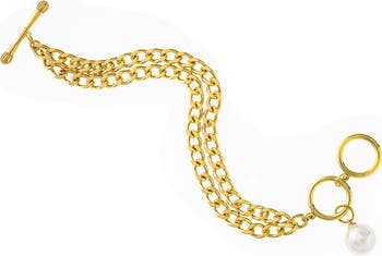 A singular lustrous faux pearl anchors one of the open toggle rings of this double-strand curb-link bracelet for an instant stacked look.