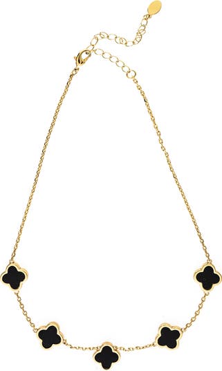 Clover stations inlay with onyx stones define a chain necklace, gleaming 18‑karat gold plating for radiant shine.
