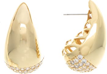 Pavé CZ dazzles the teardrop silhouette of these half-hoop earrings plated in gleaming 18-karat gold.
