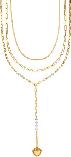 A trio of 18-karat gold-plated necklaces made from assorted chain are detailed with a heart pendant and faux-pearl adornments to elevate your look.