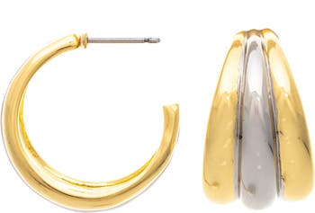Curved lines and mixed metal finishes shape these hoop earrings, gleaming 18‑karat gold plating for radiant shine.