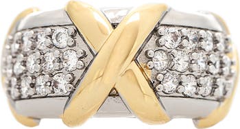 Gleaming Xs mark the band of this polished two-tone ring highlighted by sparkly pavé cubic zirconia.