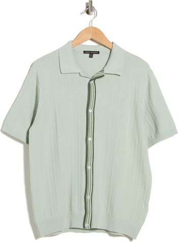 Vertical stripes highlight the button placket of shirt short-sleeve cardigan knit from cotton.