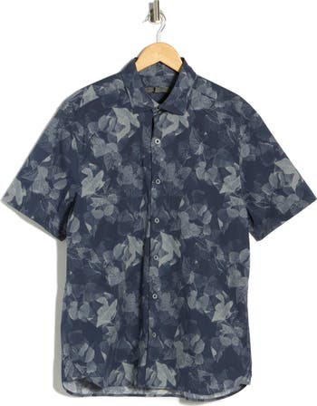 Seize the day in this short-sleeve button-up short cut from stretch-enhanced cotton fabric covered in a leaf print.