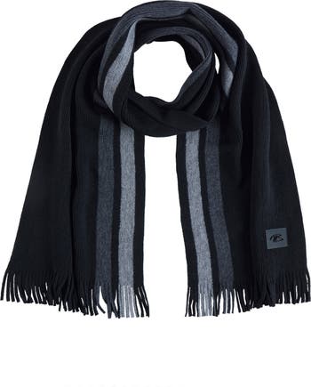 Stay cozy in this fringe-trimmed scarf knitted from merino wool in a striped pattern and finished with a signature brand patch.