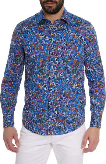 Tap into your inner artist every time you wear this crisp button-up shirt featuring a colorful abstract pattern and a contrast print at the collar and cuffs.