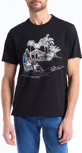 Get in a getaway state of mind with this cotton T-shirt featuring a tropical line-drawn graphic splashed with rainbow hues.