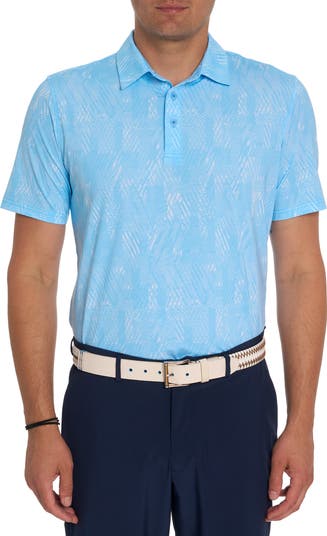 A subtle monotone pattern of crisscrossed lines details a performance polo offering sun protection and moisture-wicking properties.