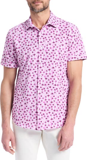 A bold floral print brings contemporary style to this short-sleeve button-up shirt cut from a soft cotton-blend knit for daylong comfort.