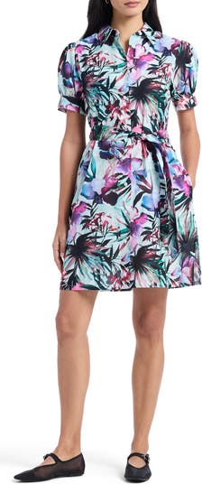 Tropical flowers amplify the resort-ready charm of this breathable cotton shirtdress framed by pretty puff sleeves, a removable tie belt and handy pockets.