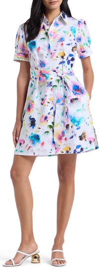 Watercolor flowers amplify the sunny-day charm of this breathable cotton shirtdress framed by pretty puff sleeves, a removable tie belt and handy pockets.