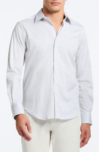 Patterned with small geometric motifs, this crisp cotton button-up shirt is enhanced with stretch for easy movement and a look that works tucked or untucked.