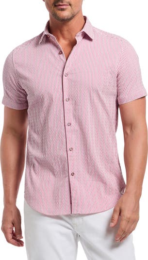 A seersucker jacquard of zippy stripes keeps you cool when the temps spike in a sport shirt you can always rely on for a put-together look.