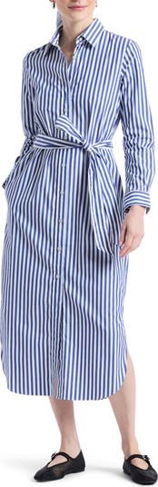Bold stripes enhance the preppy charm of this crisp cotton-blend shirtdress framed by a removable tie belt, practical pockets and a curved hem.