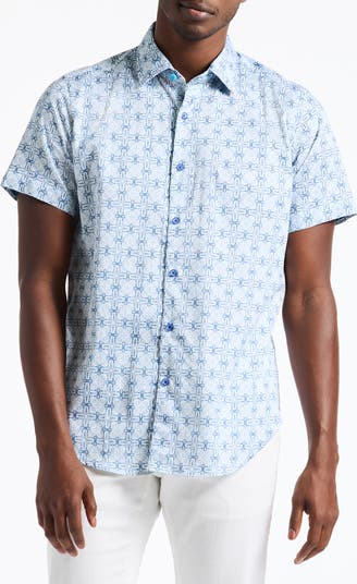 Effortlessly cool, this short-sleeve button-up shirt is cut from stretch-enhanced cotton and finished with a geometric print making it ideal for any warm-weather occasion.